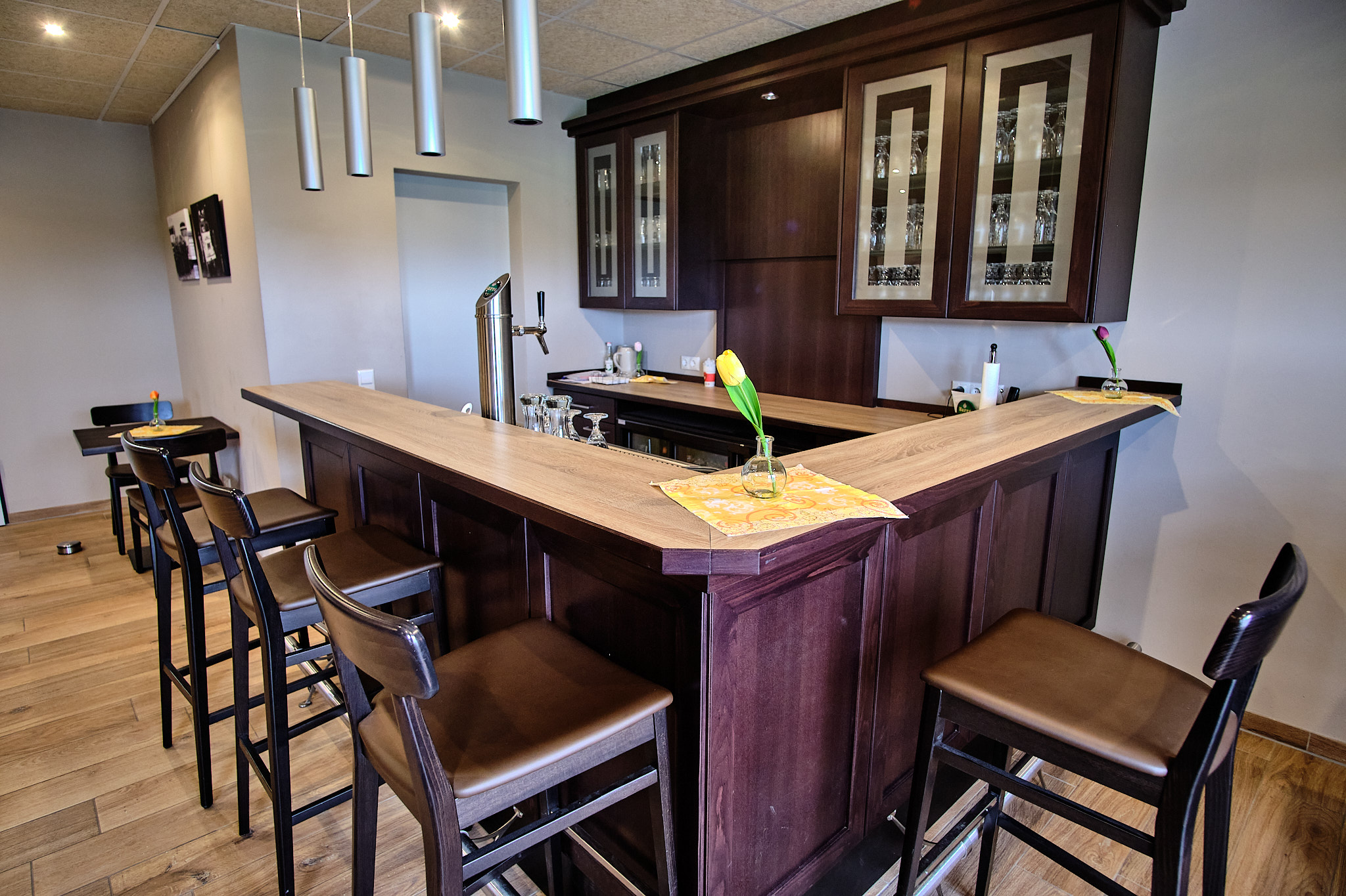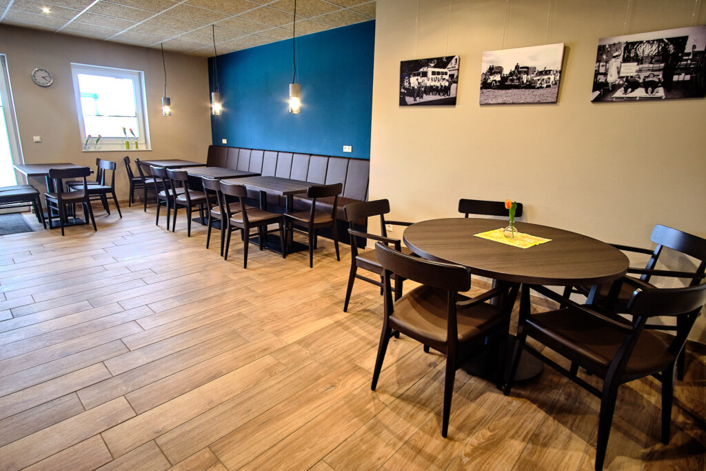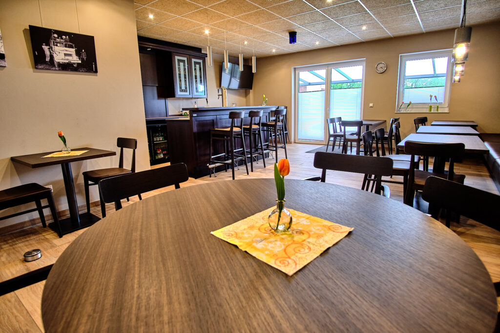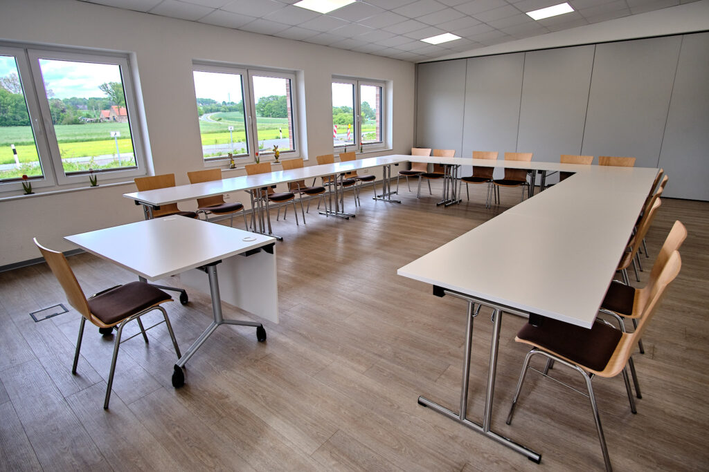 - Ein Veranstaltungsraum mit Bestuhlung, Terrassenzugang und Thekeneinrichtung zur Ausgabe von Verpflegung und für gesellige Veranstaltungen
